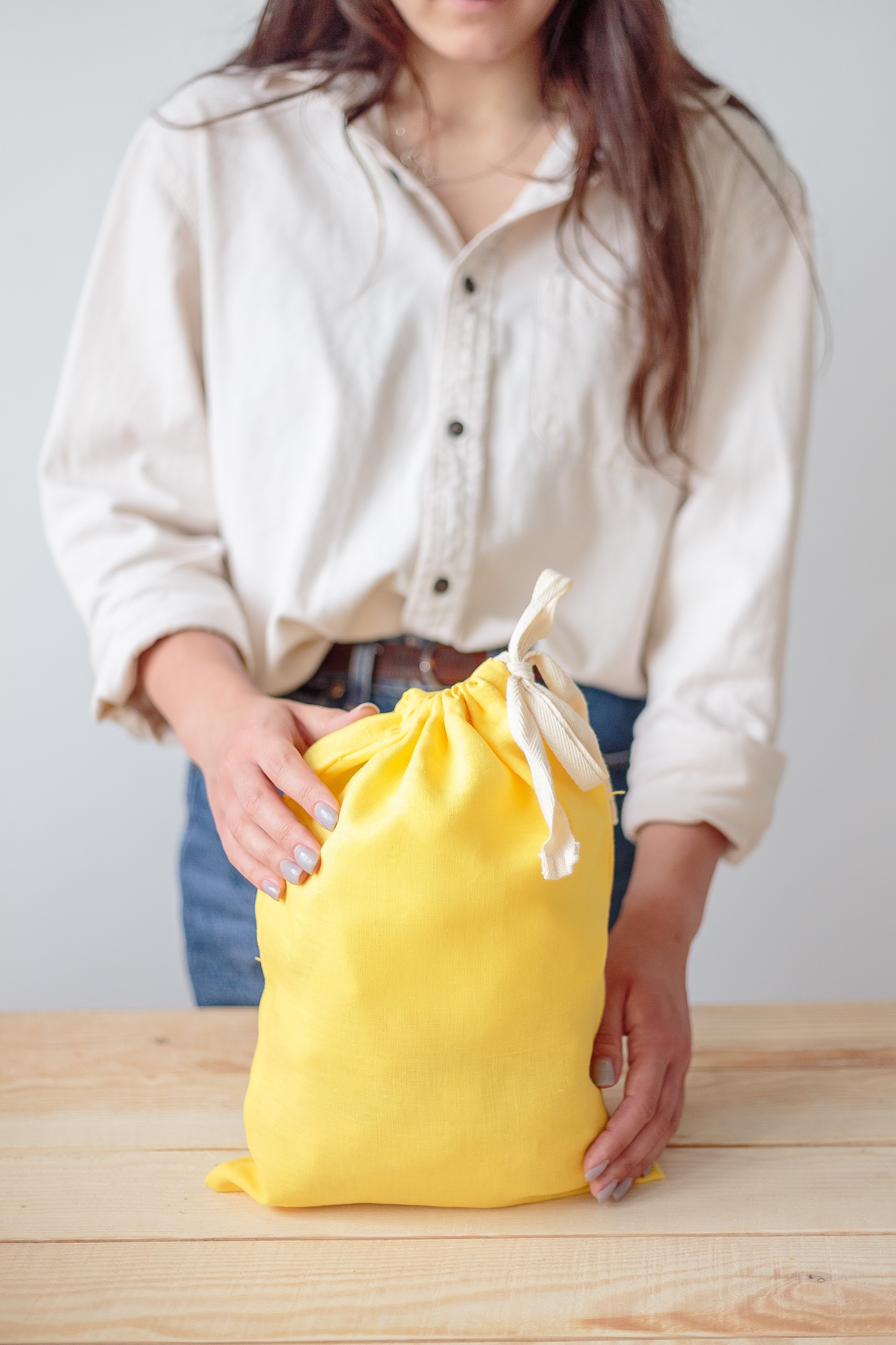 These bags are made of MEDIUM weight European Washed linen with cotton string closure, and finished with a french seams to prevent raveling.