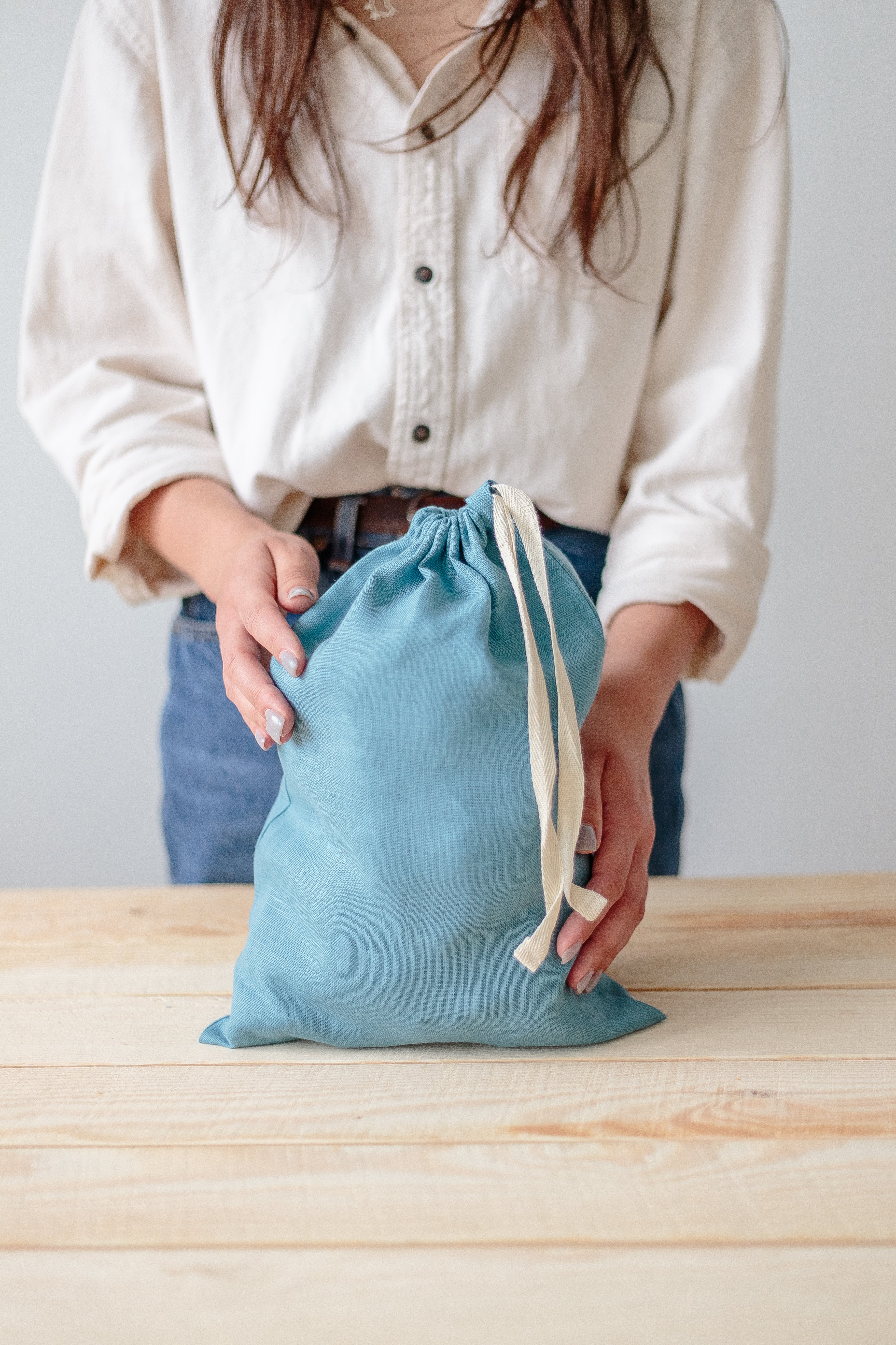 These bags are made of MEDIUM weight European Washed linen with cotton string closure, and finished with a french seams to prevent raveling.