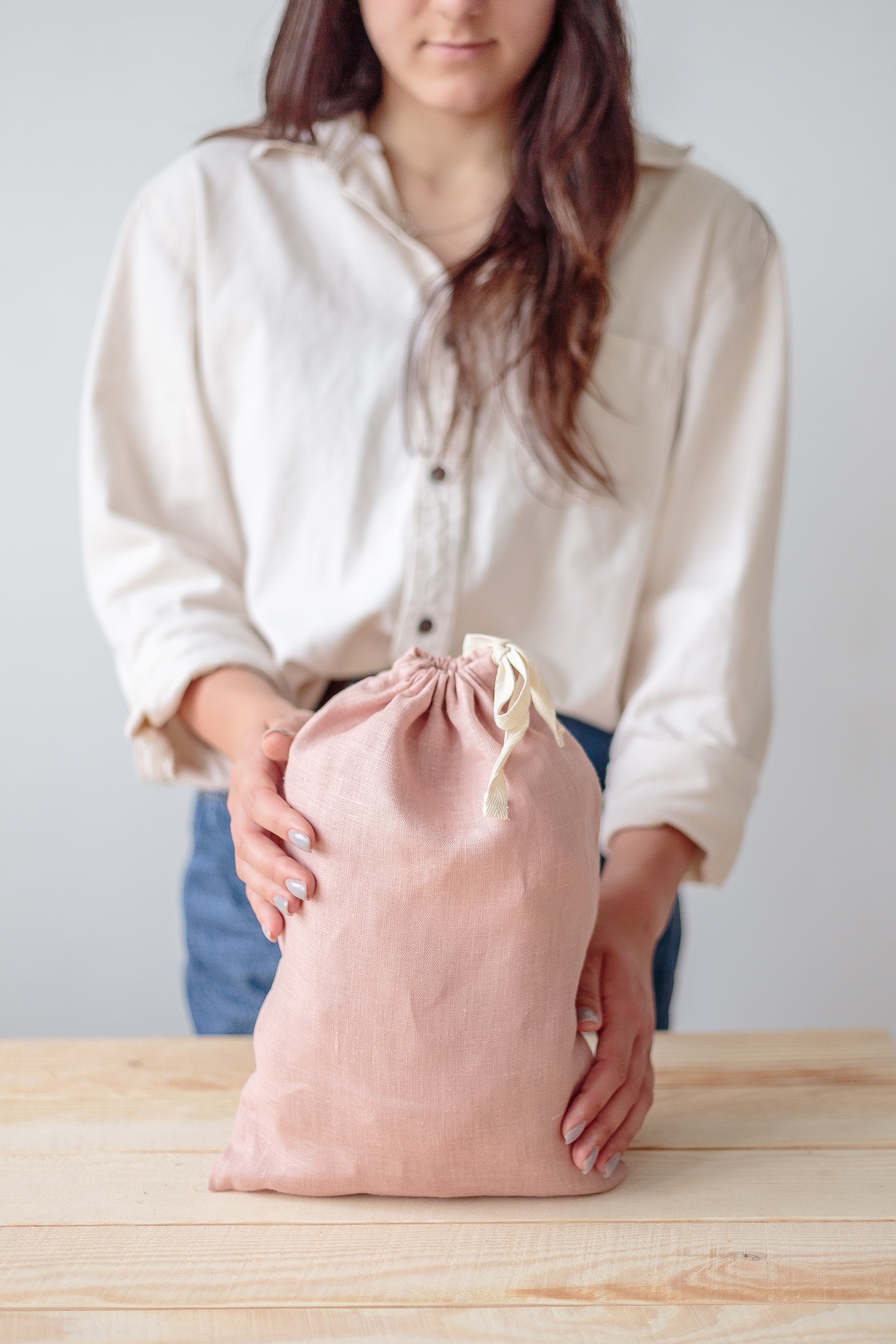 These bags are made of MEDIUM weight European Washed linen with cotton string closure, and finished with a french seams to prevent raveling.