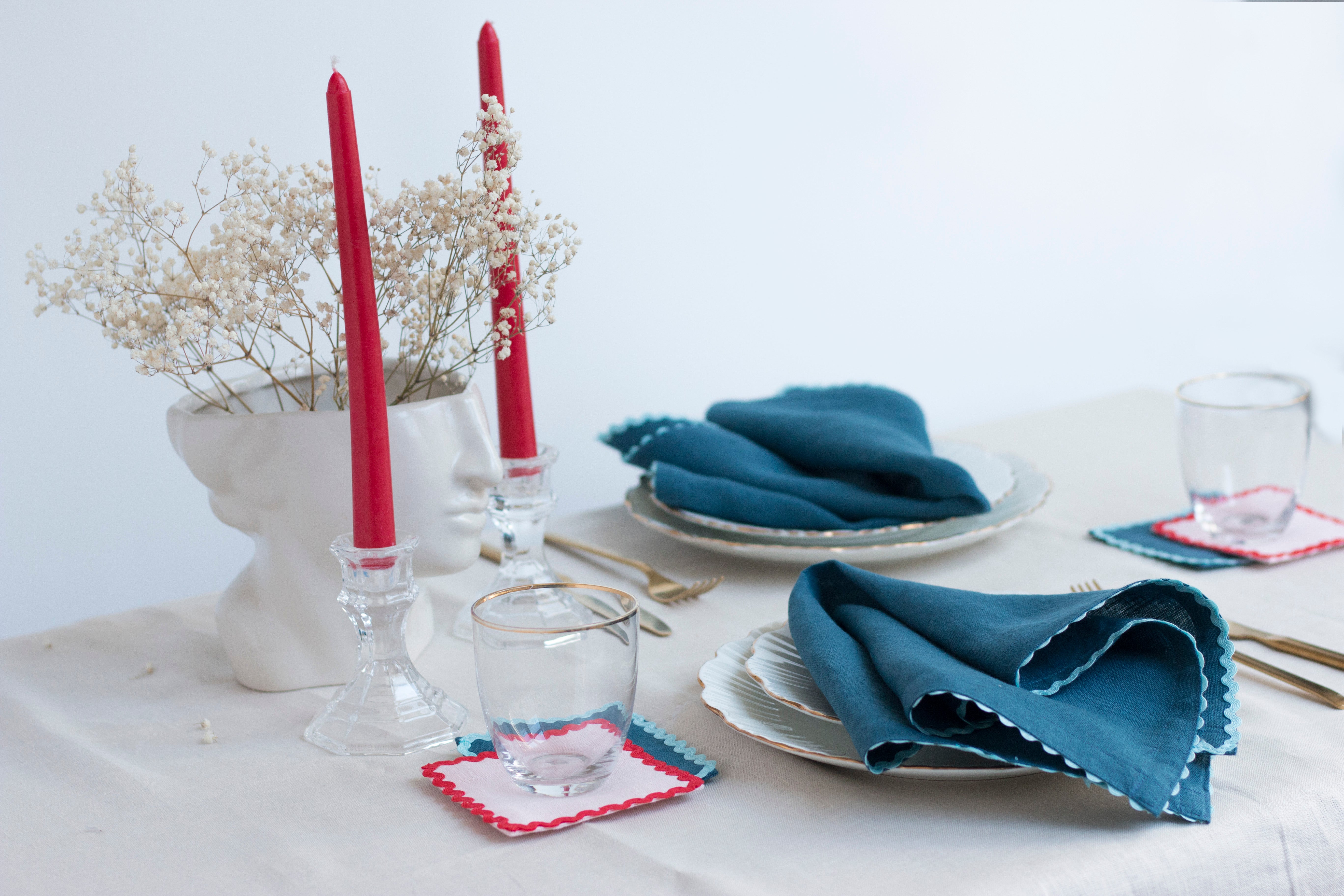 Set of 2 Deep Ocean Linen Napkins With Blue Rick-Rack Trim