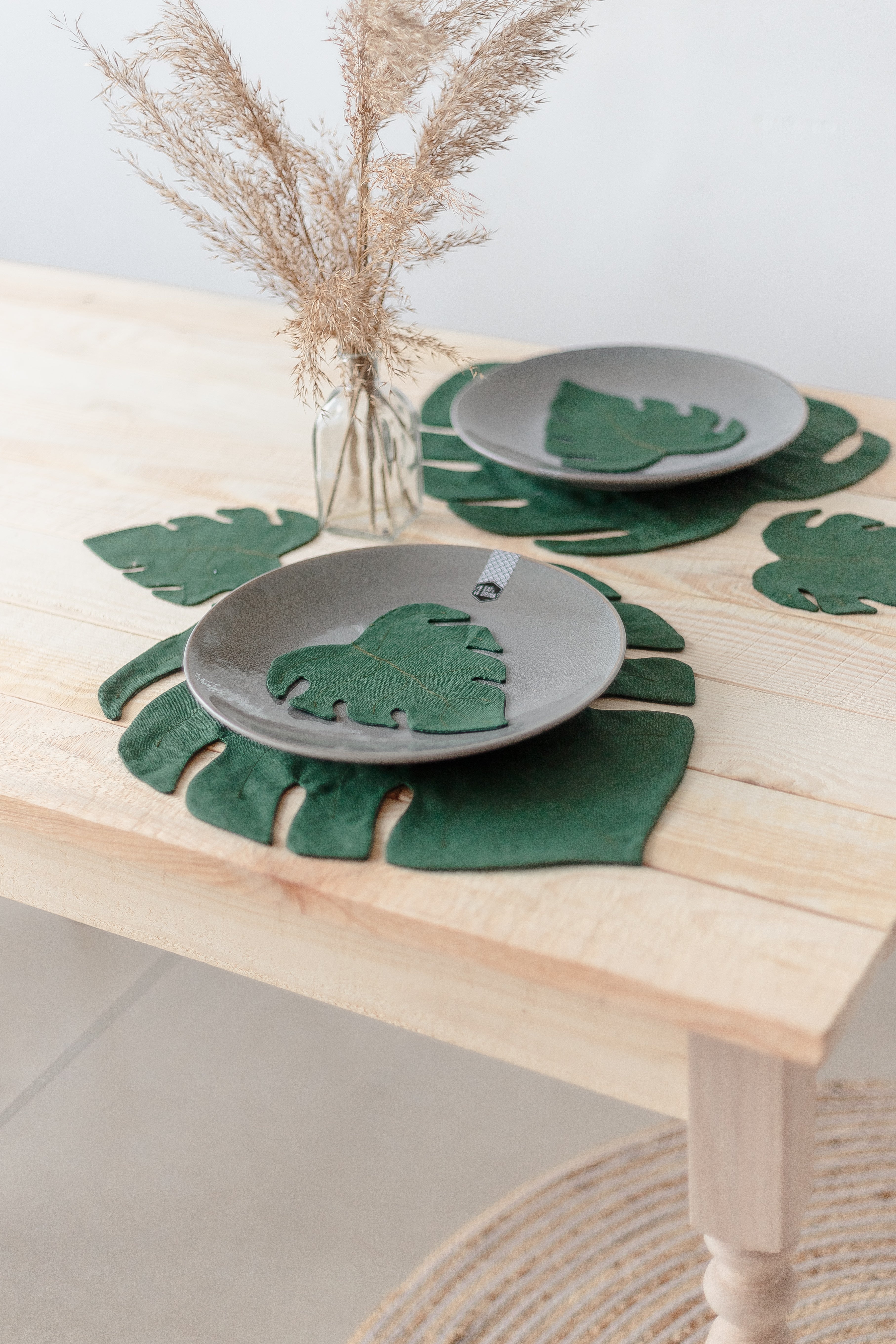 Our exquisite Linen Monstera Leaf Coasters, crafted with care and attention to detail. It's made with two layers of premium medium weight pure linen fabric and secured with stitching in the middle, ensuring that your tabletops are protected from moisture and heat.